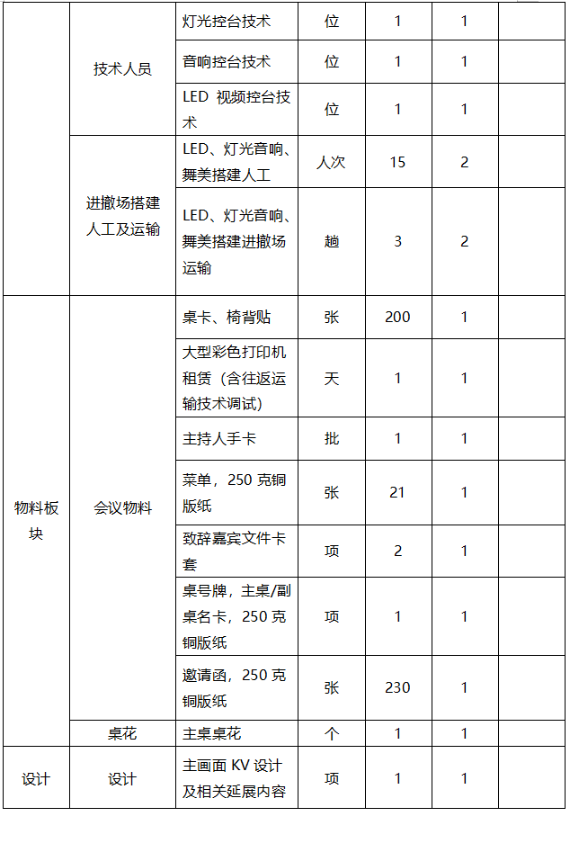 供应商报价须包括各项目对应的物料、设备、人工、制作、运输、安装、调试、拆除、后期服务、保险、应急保障、税费等全部费用,不得超过总费用预算,无任何隐藏增项。