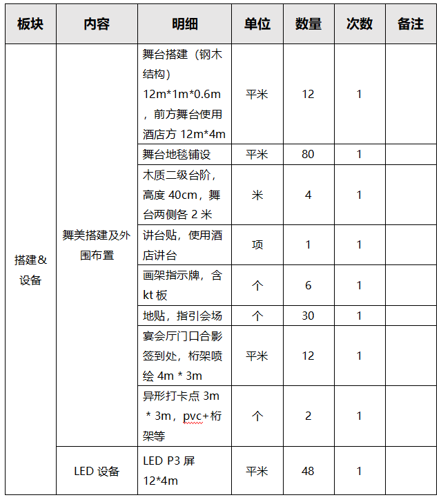注:项目采购内容中列明的项目数量为预估采购数量,合同结算时按 “实际服务量 × 中标单价” 执行。所有报价含物料、设备、人工、制作、运输、安装、调试、拆除、税费、后期服务等全部相关费用。
