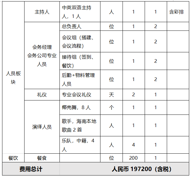 3.人员支持:主持人、礼仪人员、会务统筹及执行人员、技术保障专员等。