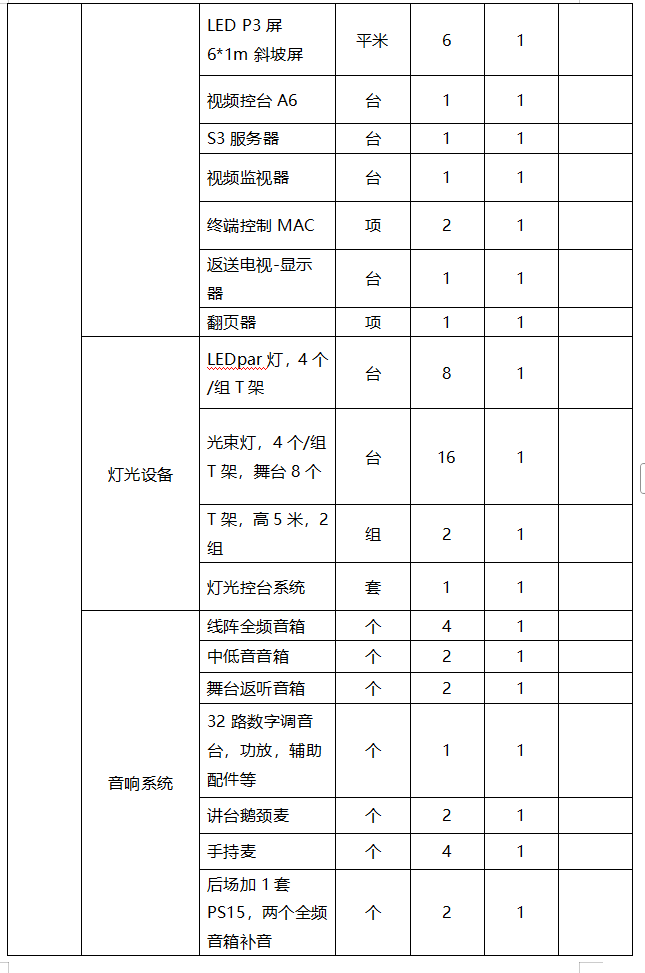 1.视听设备:专业音响系统、高清摄像机及导播台、LED大屏或投影系统、无线麦克风等。