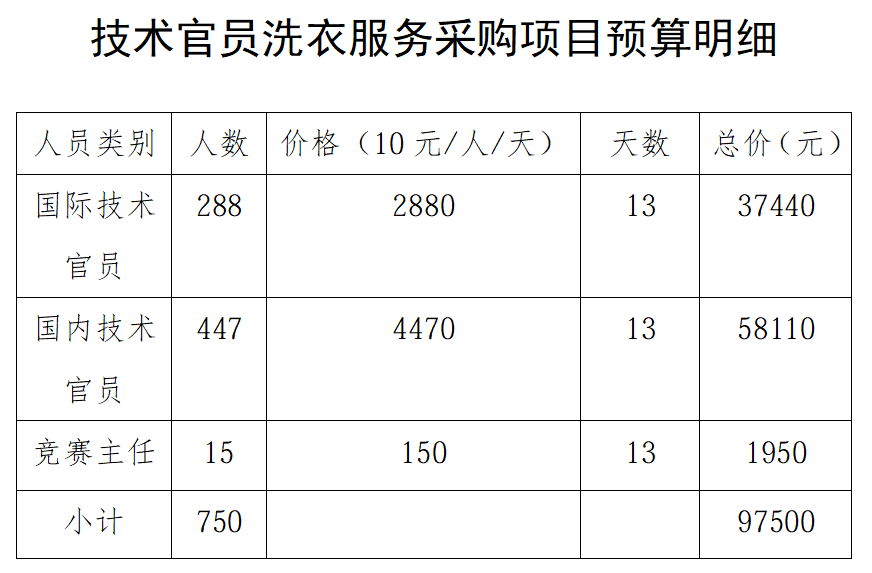 (一)项目预算:9.75万元(沙滩足球技术官员干洗部分按照实际干洗衣服的数量据实结算,收费标准为15元/件)。