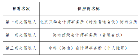 第六届亚洲沙滩运动会合同履行和支出情况审计服务项目(第二次),于2025年7月14日9:30开标,参与本项目报价的供应商共有3家:北京兴华会计师事务所(特殊普通合伙)海南分所、海南朗荣会计师事务所(普通合伙)、中称(海南)会计师事务所(个人独资)。 第六届亚洲沙滩运动会执行工作委员会成立询价小组,分别审查了供应商的资格条件,3家供应商均符合要求。按照低价中标的原则,将询价结果公示如下: