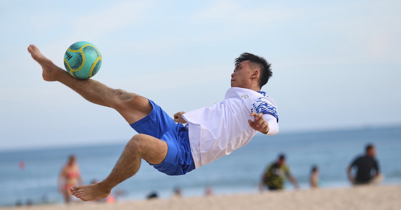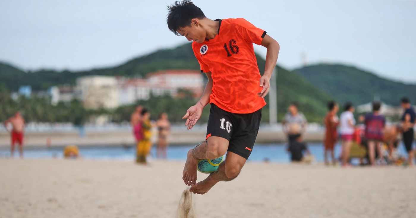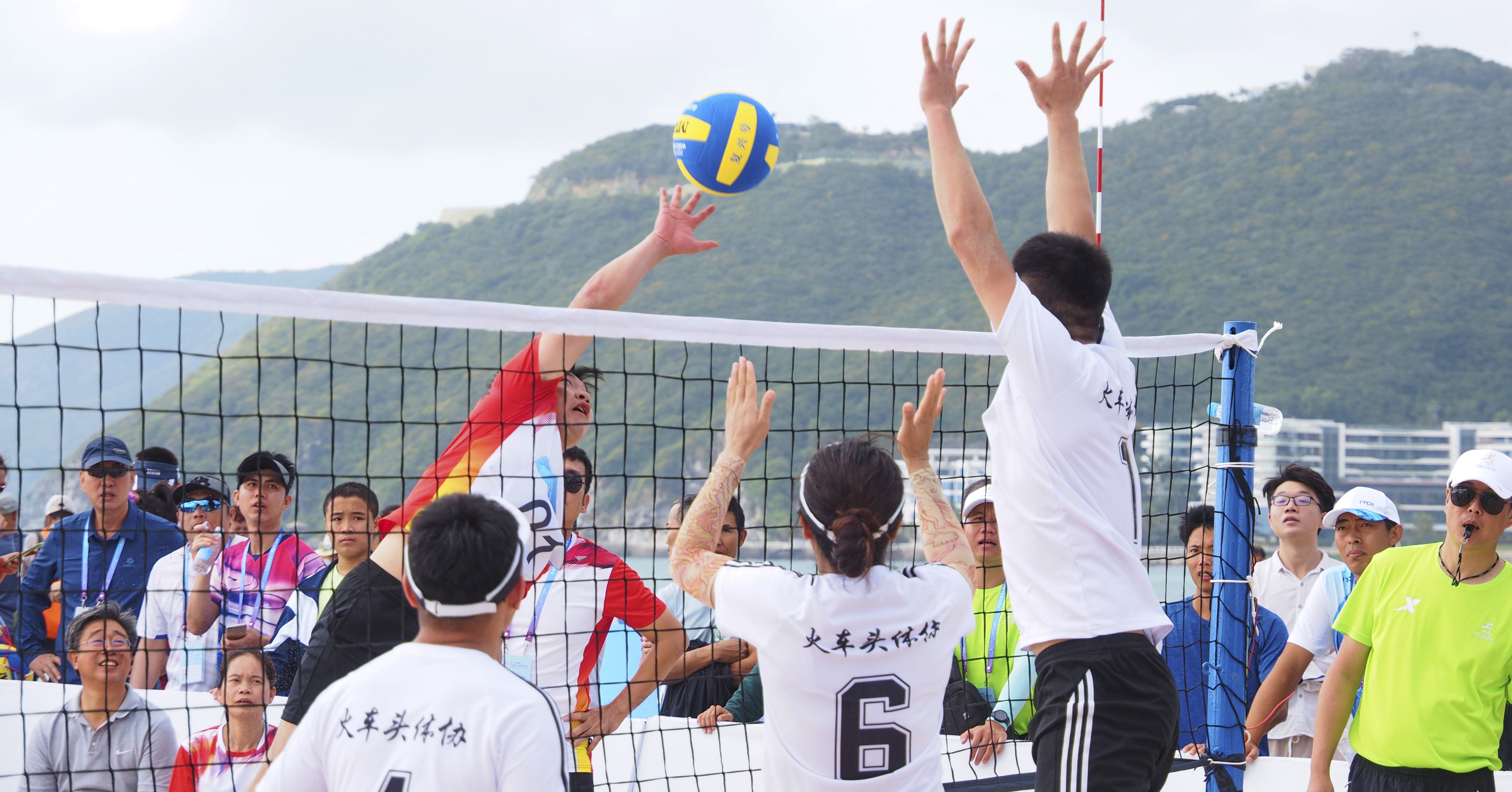 2019年沙滩职工运动会,一场激烈的沙滩排球赛正在进行。