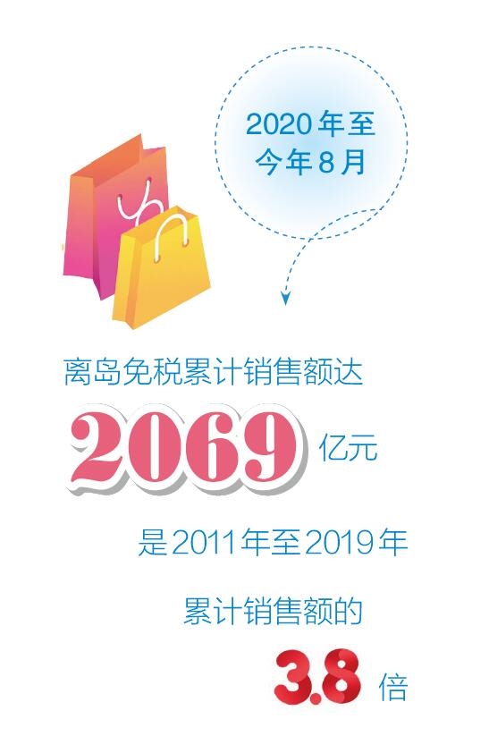 离岛免税购物扎根海之南,不断发展壮大,澎湃消费活力,已成为海南自贸港的“金字招牌”:2020年至今年8月,离岛免税累计销售额达2069亿元,是2011年至2019年累计销售额的3.8倍;离岛免税政策的持续优化,有力促进了国际旅游消费中心建设,目前海南离岛免税销售规模在全球免税市场的比重已超过8%。
