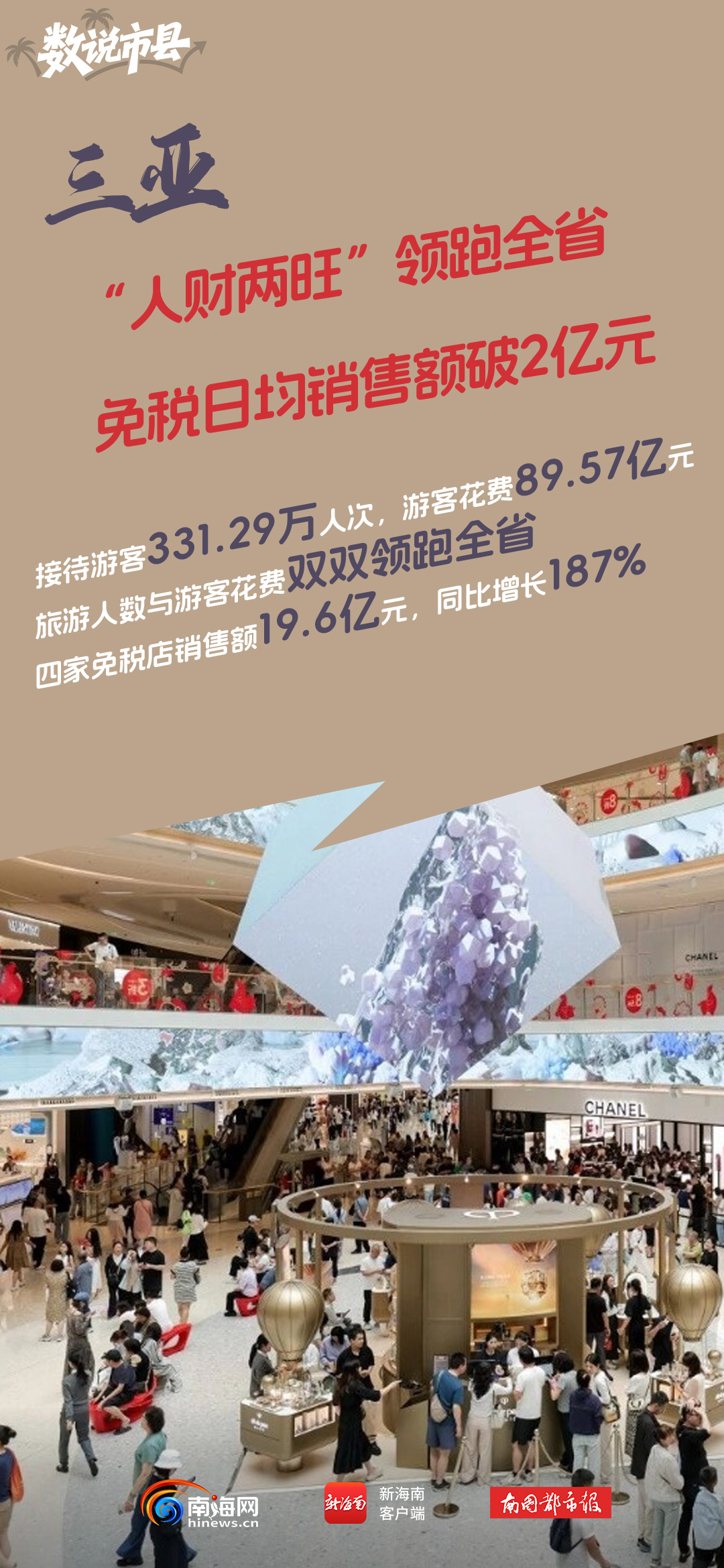 今年春节假期,三亚接待国内外游客331.29万人次,同比增长14.64%;游客总花费89.57亿元,同比增长18.72%,旅游人数与游客花费双双领跑全省。