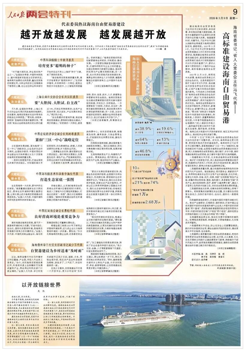 围绕高标准建设海南自贸港,吴少玉建议,要让政策进一步下沉,转化为田间地头的具体项目,“同时,继续做强非遗和乡土特色产业链,补齐农村医疗、养老、教育等短板,让自贸港建设成果更多更公平惠及群众。”(记者李君强采访整理)