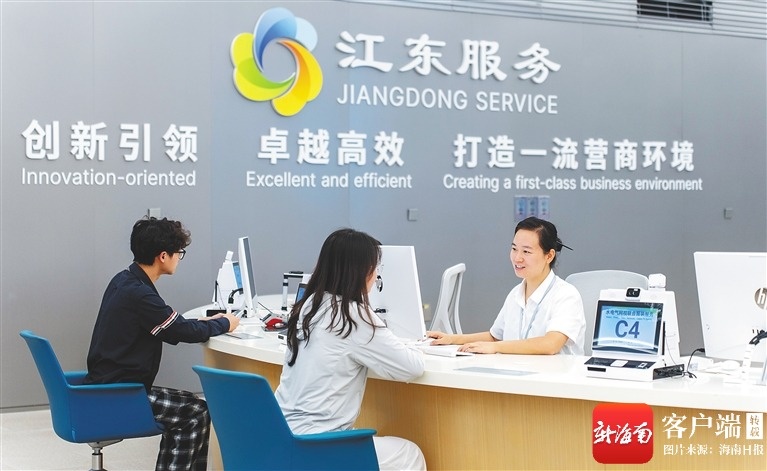 四月七日,在海口江东新区政务服务中心,工作人员为企业群众办理业务。