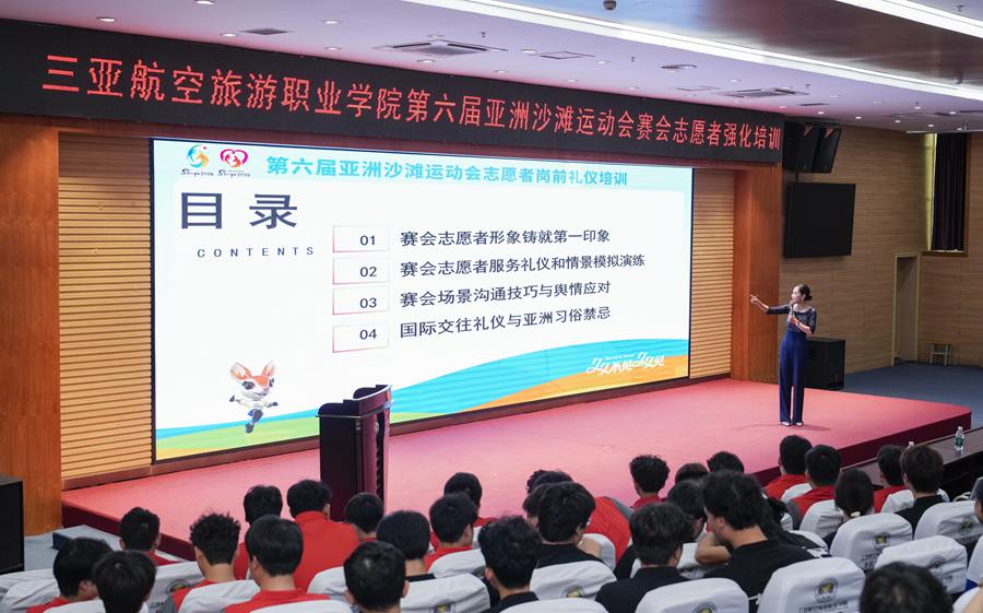 4月3日下午,第六届亚洲沙滩运动会赛会志愿者强化培训在三亚航空旅游职业学院举行。开闭幕式场馆的211名志愿者参加培训。